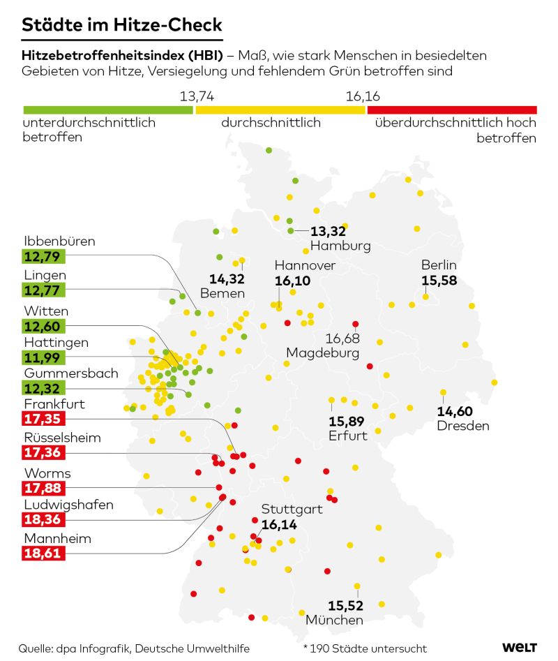 According to the Heat Vulnerability Index of the Deutschen Umwelthilfe e.V (DUH), Stadt Mannheim ranks as the city where the most people are affected by summer heat. Here a particularly large share of residents are exposed to extreme conditions. ☀️